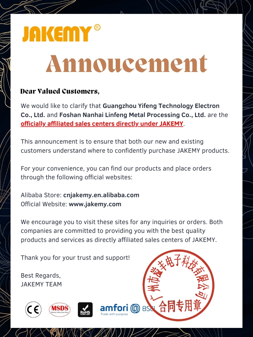 This clarification helps both new and existing customers identify authorized channels for purchasing JAKEMY products with confidence. The two companies operate with complementary division of labor: Yifeng focuses on product development (for example, precision electronic maintenance tools, Ultrasonic Cutter & Polisher, etc.) and manufacturing quality control, while Linfeng expands international market reach via Alibaba’s global e-commerce platform. Their synergistic cooperation connects upstream production and downstream sales, forming a complete industrial chain ecosystem under JAKEMY’s strategic framework.